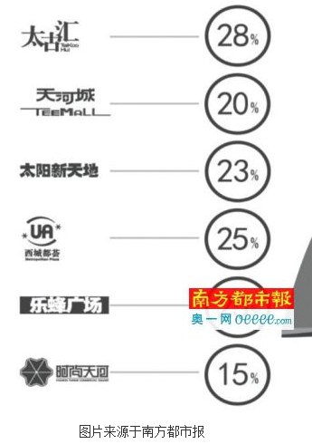 記者粗略統(tǒng)計了一下,按面積規(guī)模統(tǒng)計,正佳廣場的餐飲規(guī)模占比高達30%,太古匯、西城都薈、樂峰廣場的占比則超過25%;另外天河城、太陽新天地的占比超過20%。