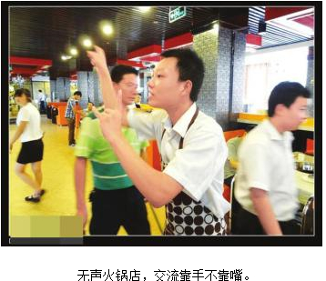 戴女士在微博看見(jiàn)朋友的介紹,特意帶著家人過(guò)來(lái),“在這里吃飯不僅覺(jué)得比平常的火鍋店安靜,心情也不一樣,心里多了一分對(duì)他們的尊敬!贝髋空f(shuō)跟他們交流并不是想象中的那么困難,“他們服務(wù)也特別周到和貼心,加茶都很主動(dòng),不用我們特別招呼!