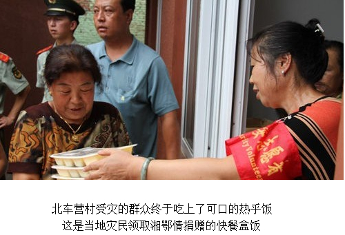 北車營村村長(zhǎng)翟瑞生說,“村民已吃了近一周的方便面,湘鄂情送來的飯菜讓大家特別高興,終于可以換換口味,品嘗到新鮮可口的熱飯熱菜了!
