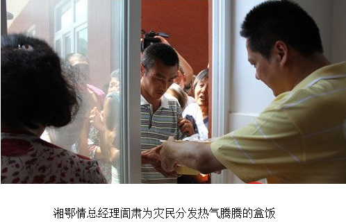 湘鄂情總經(jīng)理?肅親自帶著配餐車,趕到救災(zāi)現(xiàn)場(chǎng),向群眾分發(fā)盒飯。他表示,湘鄂情做為首家在A股上市的民營餐飲企業(yè),向?yàn)?zāi)區(qū)人民奉獻(xiàn)愛心,是履行上市公司的企業(yè)社會(huì)責(zé)任,投身社會(huì)公益事業(yè)將是湘鄂情堅(jiān)守的核心價(jià)值和長(zhǎng)遠(yuǎn)追求。