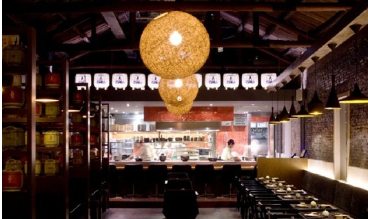 餐廳的設(shè)計以木材及花崗石的天然顏色為主,充滿現(xiàn)代氣息的燈光及堆放著的清酒桶,增添了不少日式時尚氛圍。食客可以圍坐在炭火燒烤架旁,一邊享用美食,一邊欣賞大廚在開放式廚房精妙絕倫的烹飪技藝,以及餐廳充滿活力的前衛(wèi)設(shè)計。