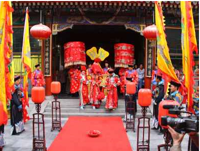 仿膳飯莊的婚宴很有中國傳統(tǒng)氛圍。新娘可以坐著八抬大轎,在眾多吹鼓手吹吹打打的簇擁下,從北海公園東門進入公園,過石橋、穿游廊再回到仿膳飯莊的大門口。新郎則將蒙著蓋頭的新娘扶下轎,在繽紛的禮花中牽著新娘邁火盆、過馬鞍,走進雕梁畫棟、金碧輝煌的漪瀾堂大廳,舉行隆重的婚禮。飯莊還為新人準備了大紅喜帳、紅地毯、香檳酒塔臺、音響等設備。如果新人有興趣,還可以租一艘龍舟,在北海水上環(huán)湖一周,寓意即將到來的新生活順風順水。
