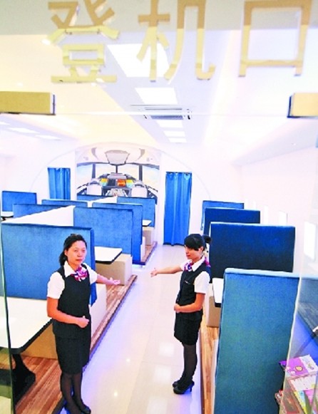 “歡迎登機(jī)!”一進(jìn)入餐廳,你就能看到服務(wù)員彎著腰,做出歡迎的手勢(shì)。“我們的服務(wù)員都是參考空姐的標(biāo)準(zhǔn)來招收,要求身高160cm以上,長相清秀,笑容甜美等!秉S慧玲介紹說,服務(wù)員統(tǒng)一著空姐制服,上班前還得接受餐飲禮儀和空姐服務(wù)方面的培訓(xùn)。