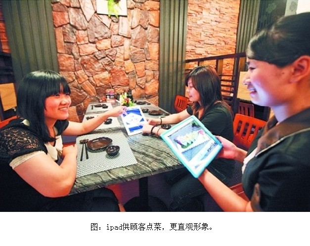 到餐廳吃飯,首先要做的就是點(diǎn)菜。傳統(tǒng)的點(diǎn)菜方式都是服務(wù)員拿著一本菜單,供顧客選取菜樣,再把菜樣填在一張單上。T淘園內(nèi)的一家日本料理店卻別出心裁,使用ipad供顧客點(diǎn)菜。