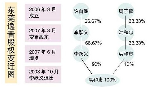 那么李躍義又是何時(shí)介入到東莞逸晉的呢?據(jù)東莞逸晉的公司決議,在2007年3月的一次股東會(huì)上,許自洲、周子健以原出資金額將手上的全部股權(quán)分別轉(zhuǎn)給了李躍義和洪和忠。轉(zhuǎn)讓后,李躍義獲得了許自洲手上的66.67%股權(quán)。隨即,公司章程也進(jìn)行了修改,李躍義擔(dān)任了公司唯一一名執(zhí)行董事、經(jīng)理和法定代表人。