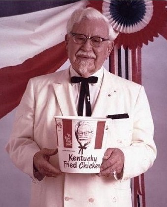 創(chuàng)始人桑德斯上校創(chuàng)辦肯德基時66歲,靠每月的$105社保生活。在肯德基獲得成功而接受電視臺采訪時,他找出自己唯一一套干凈的、白色棕櫚裝,從此這一打扮成為他獨特的標(biāo)識造型,并以此注冊商標(biāo)。從此以后,人們便將這套西裝與肯德基聯(lián)想在一起;而他的這身白西裝,滿頭白發(fā),及山羊胡子也成為了全國性的象征。因為生意做的好,肯德基州長于1935年封他為肯德基上校,以表彰他對肯德基州餐飲的貢獻(xiàn)。