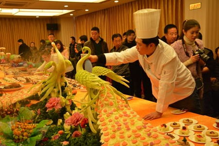 這121道菜品是充分利用一整頭人工飼養(yǎng)的野豬烹制而成,其體重在300斤以上,從頭到尾,加上皮、骨頭、豬腳、內臟等都被名廚們烹制成了美味。由于菜式較多,烹制工藝復雜,所以前期籌備用了4天的時間,正式上灶烹制是在30日21時許,并于31日10時30分全部制作完畢。這么做的目的就是要保證各道菜品的食材優(yōu)良,菜色優(yōu)美,由此給觀賞者帶來視覺和味覺上的雙重享受。