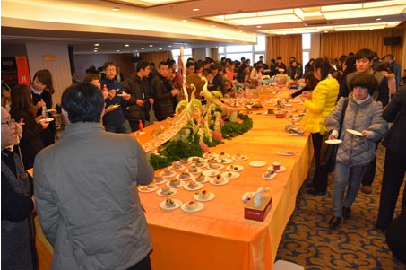 “跨年”野豬盛宴脫離了那種傳統(tǒng)的圓桌模式,以西方宴會特有的自助形式呈現(xiàn)在眾多美食達人面前。在一張寬3米、長15米的大型餐桌上,121道菜品被分成了13個區(qū)域進行擺放。