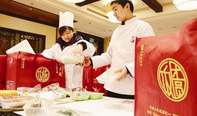 近日,蘇州某飯店服務員為“打包年夜飯”配菜。春節(jié)將至,蘇州一些“老字號”餐飲單位推出品種豐富的半成品“打包年夜飯”,讓市民在家中就能吃到美味可口的年夜飯。這樣既節(jié)儉又方便,受到消費者青睞,銷售十分火爆。