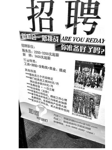 在朝陽區(qū)藍(lán)色港灣餐飲街,“高薪誠聘服務(wù)員”的字樣隨處可見,有的餐廳為了吸引人員應(yīng)聘,甚至將年會(huì)抽獎(jiǎng)、員工日本游、CS拓展訓(xùn)練等福利信息放在招聘廣告上,但這樣依然難解用工緊張局面,一些向來只招年輕服務(wù)員的飯店也不得不把招聘條件放寬至“阿姨級”。