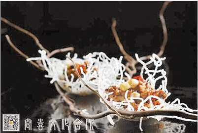 比如,一道名叫玉樹后庭花的菜,其實(shí)就是宮保豆腐,造型非常優(yōu)美,將宮保豆腐裝在像是樹枝的丫上,每個(gè)丫上還有一個(gè)雪白的類似鳥巢的盛器,看起來晶瑩剔透。