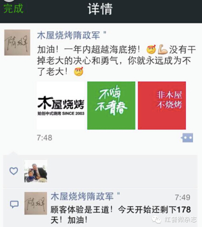 比起宣布獲得1億風投這一消息時的低調,隋政軍在“一年內超越海底撈”這件事情上卻顯得格外高調,每天清晨,隋政軍的第一件事就是發(fā)一條這樣的朋友圈,不是示威、不是強迫,這是激勵,是奮斗,是堅持,是一個成功創(chuàng)業(yè)者應有的理想?峙聸]有幾個人敢像他一樣每天把自己的目標重復一次,被所有認識的人監(jiān)督。 低調做慈善 打造懂得感恩的團隊。