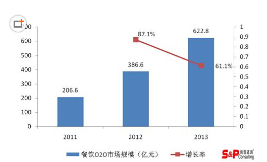 中國餐飲行業(yè)的線下市場規(guī)模非常龐大,這為餐飲O2O行業(yè)發(fā)展提供了廣闊的空間。有關(guān)數(shù)據(jù)顯示,2011年中國餐飲O2O市場規(guī)模為206.6億元;2012年中國餐飲O2O市場規(guī)模為386.6億元,同比增長87.1%;2013年市場規(guī)模達(dá)到622.8億元,同比增長61.1%。
