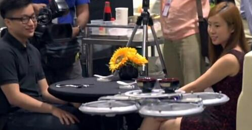 利用無人操控飛行器科技概念,Infinium Robotics公司研發(fā)出“自助無人操控飛行托盤”,服務(wù)生只要預(yù)先輸入桌號(hào)后,把食物放在托盤上,托盤就會(huì)自動(dòng)飛行到客人附近。