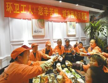 “謝幺爸,你不是經(jīng)常吼好想吃頓火鍋得嘛,今天可以敞開肚皮整哦!”“今天就算我們提前團(tuán)年啦!來大伙一起喝一杯!180名環(huán)衛(wèi)工人一邊燙著火鍋,一邊擺著龍門陣。原來,這些被邀請來的環(huán)衛(wèi)工們,全部為轄區(qū)一線的環(huán)衛(wèi)工,平均年齡50多歲。50多歲的李大姐干環(huán)衛(wèi)工已有八年時間,她說,今天的火鍋不僅味道巴適口感舒服,更覺得心里暖和。吳大姐接過話來,“你看這么漂亮的店堂還專門貼上了標(biāo)語:“最辛苦的人——環(huán)衛(wèi)工人”;“環(huán)衛(wèi)工人!您辛苦啦,城市因你而美麗”真讓人感覺貼心、暖心……