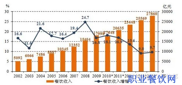 據(jù)國家統(tǒng)計局最新發(fā)布的數(shù)據(jù)顯示,2014年全國餐飲收入27860億元,同比增長9.7%,比上年加快0.7個百分點(diǎn),終止了連續(xù)三年增速下滑的頹勢。中國烹飪協(xié)會會長姜俊賢表示,按照這一增速,2015年中國餐飲業(yè)將邁入3萬億元新時代。