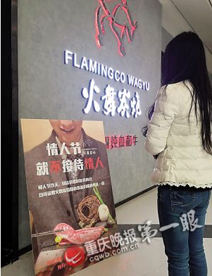 位于南岸區(qū)時(shí)代星光廣場(chǎng)的火舞炭燒主營(yíng)炭燒、烤肉,他們打出的廣告詞是———情人節(jié),就不接待情人(如圖)!拔乙呀(jīng)給服務(wù)員打好招呼,遇到手挽手成雙成對(duì)的恕不接待。”老板蔡彥旭,情人節(jié)不能只有耍朋友的開(kāi)心了,單身的人悲傷度過(guò)。他準(zhǔn)備唱反調(diào)到底,他還會(huì)給屆時(shí)前來(lái)就餐單身人士準(zhǔn)備一份禮物。