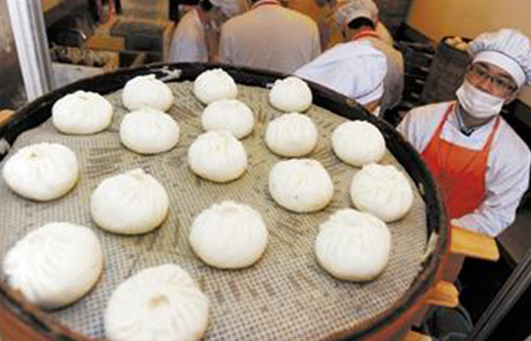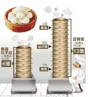在甘其食,每個(gè)人都會(huì)看到壘得很高的蒸籠,如果細(xì)心一點(diǎn)你會(huì)發(fā)現(xiàn),其他包子店,頂多只能壘6層,不是不想多蒸幾籠提高效率,而是再高就熟不了了。甘其食最高能夠達(dá)到13層,“從9層到10層再到13層,這個(gè)是經(jīng)過(guò)了多少次試驗(yàn)、重新定制蒸鍋等設(shè)備才能達(dá)到的!蓖瘑⑷A說(shuō),不光如此,下面幾層以下只能蒸肉包,中間幾層蒸豆沙包等都是有白紙黑字規(guī)定的,最上面只能蒸青菜香菇包。“蒸包子是有講究的,肉是生的,青菜香菇是半熟的,一定要同時(shí)熟才行!