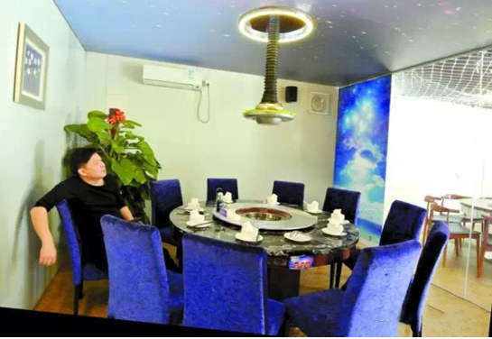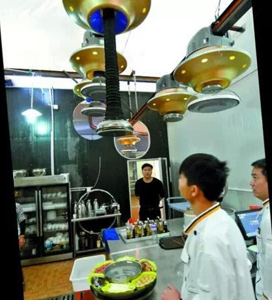 進(jìn)入餐廳,首先映入眼簾的是頭頂上灰藍(lán)的太空和耀眼的星星天幕,最奇特的是有幾只金色的飛碟吊著托盤,托盤上盛滿菜,沿著軌道在“太空”中運(yùn)轉(zhuǎn)。當(dāng)運(yùn)轉(zhuǎn)至餐桌上方,飛碟會(huì)自己停住,伸下長長的“腰”,將菜送至客人面前。