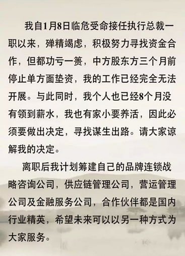 只可惜短短4個(gè)多月的時(shí)間,戚東就已招架不住,提出辭職。其在辭職信中坦言,自接任總裁一職以來(lái),積極努力尋找資金合作,但都功虧一簣。中方股東也在三個(gè)月前就已經(jīng)停止單方面墊資,使得運(yùn)營(yíng)工作完全無(wú)法開(kāi)展。而他本人已經(jīng)有8個(gè)月沒(méi)有領(lǐng)到薪水。