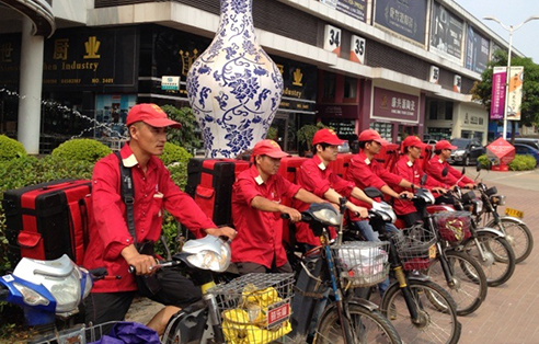 現(xiàn)在我有13個專職送餐員,4個兼職送餐員,還有外包物流公司的配送人員,一共20來個人,其中有總負責人。距離遠的地方,我就放兩個人在那邊待著,餐廳的人像接力棒似的,25分鐘會過去一趟。高峰期就馬上放一個人過去,一趟送完再回來接力。中午最多是2個高峰期,11點半和12點。我也會按區(qū)域劃片,高峰期不同的區(qū)域會有不同的人負責。我對送餐員也會有培訓,高峰期不同的線路會互相支援。