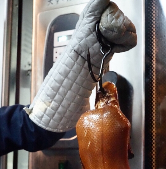 烤鴨一出爐,就會(huì)被立刻分割,如果沒有馬上做成漢堡送到運(yùn)氣超好的客人的嘴里,就會(huì)把分好的鴨皮和鴨肉分開專門保溫。對(duì)烤鴨了解至極的大董專門為鴨皮和鴨肉分別設(shè)計(jì)了不同的保溫箱,溫度和濕度都不一樣,以保持剛出爐的風(fēng)味。鴨子最多在里面呆四十分鐘,這是大董認(rèn)為可以保持鴨皮噴香酥化、鴨肉多汁鮮嫩的完美狀態(tài)的時(shí)間范圍。在這個(gè)時(shí)間內(nèi)沒有用完的鴨子,就不要了。
