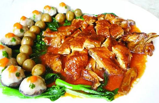 制作茅臺雞,還必須有百花釀花菇、草菇和菜心軟伴碟。百花釀花菇是用新鮮的蝦肉打成蝦膠,每粒5錢重釀入1元硬幣大小已經(jīng)入好味的花菇內(nèi),需釀制10粒,最后在百花餡上點(diǎn)上新鮮的蟹膏。