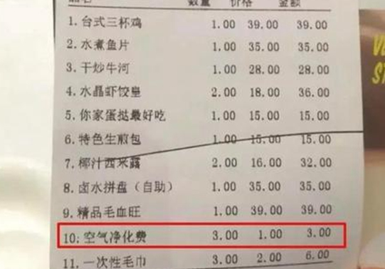 原來(lái),該餐廳為優(yōu)化用餐環(huán)境,購(gòu)置了空氣凈化器凈化餐廳空氣。為彌補(bǔ)設(shè)備及運(yùn)營(yíng)費(fèi)用,便自作主張?jiān)诓唾M(fèi)之外加收每位1元的“空氣凈化費(fèi)”。
