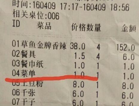 馬先生說,當時一共消費了248元,他仔細查看賬單,發(fā)現(xiàn)除了一家人消費的菜品、餐具以及餐巾紙的價格外,第四項赫然寫著菜單的價格收費一元。他當即向服務員提出異議,對方只稱規(guī)定是老板定的。
