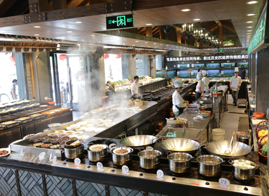 第一家店開了之后,生意很好,驗(yàn)證了之前他對(duì)市場(chǎng)的分析。又經(jīng)過一番準(zhǔn)備,2014年,江南大院的土菜文化博物館的大院模式出現(xiàn)了,江南大院的第二家店,面積逾4000平米。這家店在體量上滿足了江南大院對(duì)于土菜展現(xiàn)的要求,門口600多平米的明檔,更讓消費(fèi)者更直接體驗(yàn)到土菜的氣氛。