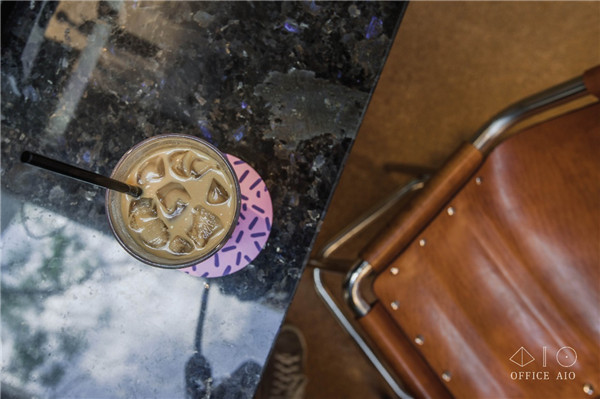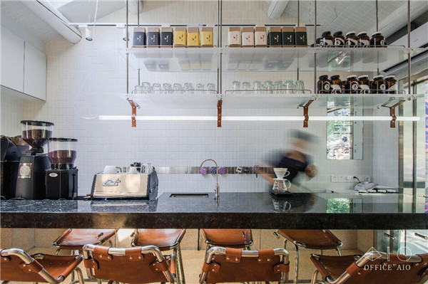 因為空間面積有限,很容易被“一眼看透”,因此在一些地方增加細碎感的設(shè)計反而可以為空間提供更多“信息量”,讓顧客的目光被不同的細節(jié)吸引,增加空間的層次和趣味,比如杯墊和糖罐上就是色彩和排版上比較活潑的設(shè)計,還有門把手、高腳凳、燈管懸吊處的天然皮革定制配件。