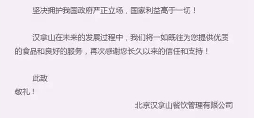 網(wǎng)友們表示,在本次愛國事件中炸出了漢拿山這么一個(gè)“漢奸”,當(dāng)初打著正宗韓餐的招牌賺得盆滿缽滿之后,現(xiàn)在出來劃清界限。但也是一個(gè)不可避免的現(xiàn)實(shí),因?yàn)槊鎸?duì)利益沖突的兩方,你的決定很難中立、獨(dú)善其身,必須得是偏向一方。這個(gè)不是公關(guān)的錯(cuò)誤,而是公關(guān)的常態(tài),是多數(shù)危機(jī)公關(guān)不得不面對(duì)的結(jié)局。