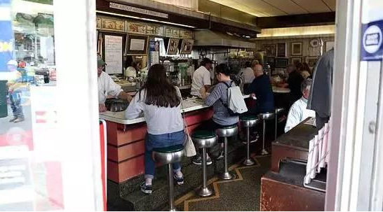 長長的柜臺配著一排高腳凳和舒適的L型用餐區(qū),這個經(jīng)典紐約小餐館的時光仿佛定格在了1940年,餐館里到處都是被木隔斷分開的塑料椅子和膠木桌子。