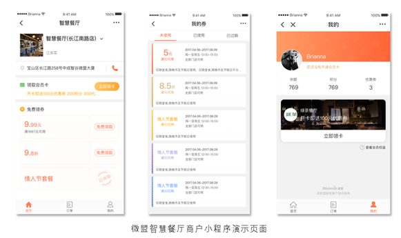 據(jù)了解,餐飲商戶通過微盟智慧餐廳后臺發(fā)布餐廳的智店小程序,智店小程序不僅能與商家的公眾號相互跳轉(zhuǎn),而且與智慧餐廳系統(tǒng)互通。目前小程序與公眾號已實現(xiàn)會員、訂單、權(quán)益等的數(shù)據(jù)互通。當(dāng)用戶進入商家的小程序時,系統(tǒng)自動識別用戶的會員身份,并且自動同步該用戶的訂單權(quán)益數(shù)據(jù)。用戶在小程序領(lǐng)取的優(yōu)惠券和會員卡與公眾號同步;同樣,用戶在公眾號里領(lǐng)的券和卡,在小程序里也能查看和使用。值得一提的是,由于微盟智慧餐廳的卡券能力與微信原生卡券體系打通,因此通過小程序領(lǐng)取的卡券可以直接添加到微信卡包。據(jù)介紹,后續(xù)微盟智慧餐廳的點餐、外賣等功能也將與小程序打通,屆時小程序的連接能力將幫助餐飲商戶連接更多的餐飲消費場景。