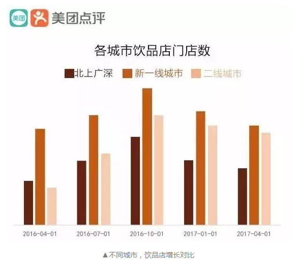 根據(jù)美團(tuán)點(diǎn)評(píng)最新公布的一項(xiàng)數(shù)據(jù)顯示,2017年4月,二線城市飲品店門店數(shù)同比增長(zhǎng)29%,而在北上廣深,這個(gè)數(shù)字是6%。