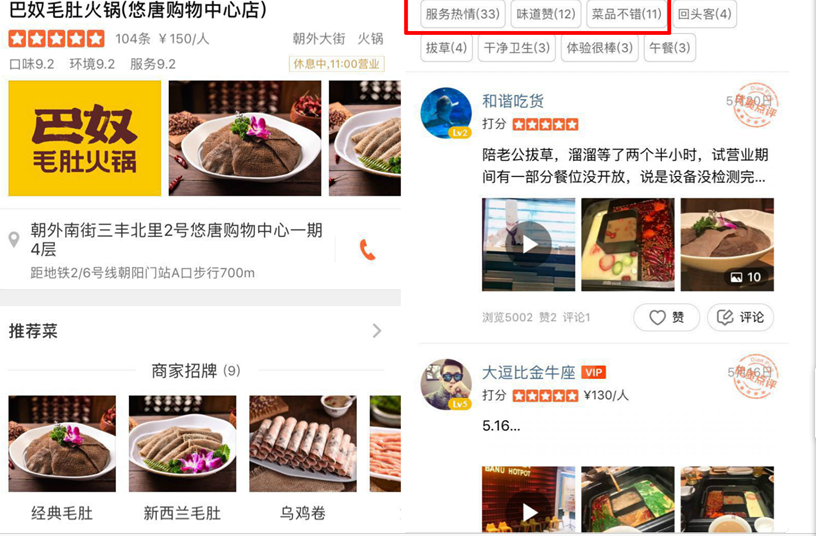 一周后,記者再次來到北京店就餐,店內(nèi)餐位已經(jīng)全部開放,仍然供不應(yīng)求。據(jù)巴奴門店負(fù)責(zé)人透露,巴奴北京店定位為毛肚專家旗艦店。試營業(yè)當(dāng)天賣了100多桌,此后幾天的數(shù)據(jù)都有增加。而從顧客的綜合評(píng)價(jià)來考核,截至發(fā)稿,巴奴北京店在大眾點(diǎn)評(píng)上已得到五星好評(píng)。97條評(píng)價(jià)中,好評(píng)89條,中評(píng)6條,差評(píng)2條。好評(píng)所夸贊的地方主要在服務(wù)、菜品、店面風(fēng)格、鍋底等方面,其中超過30位顧客點(diǎn)了“服務(wù)好”這個(gè)標(biāo)簽,而中評(píng)和差評(píng)指出的問題在價(jià)格偏貴(記者實(shí)測,人均消費(fèi)150左右)、餐位預(yù)定等方面。