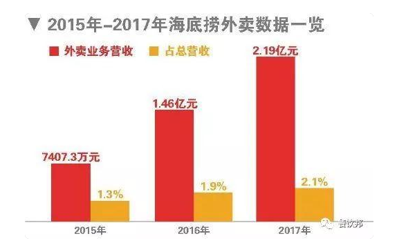 公開資料顯示,早在2010年6月,海底撈“Hi撈送”成立,成為首家推出外賣業(yè)務(wù)的火鍋餐廳,至今在國內(nèi)40余個城市推出外賣業(yè)務(wù),2017年海底撈外賣業(yè)務(wù)收入為2億元。