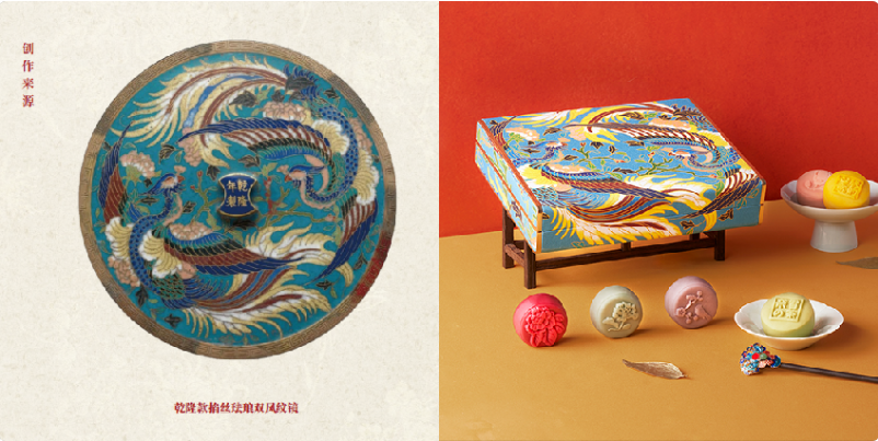 繼去年的“風雅頌”主題月餅后,今年,繼續(xù)延續(xù)“中國風”,產品設計從古董瓷器、掐絲琺瑯、宋徽宗喜愛的字畫等文物中獲得靈感,將傳統(tǒng)文化融入月餅。僅僅兩款禮盒的產品名稱,就足以使人腦補出中秋月朗、石榴滿園,鳳凰于飛、??其羽的?麗畫面。